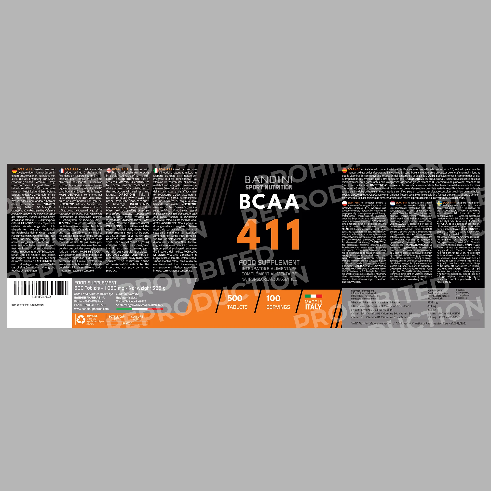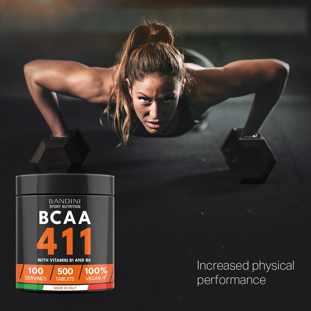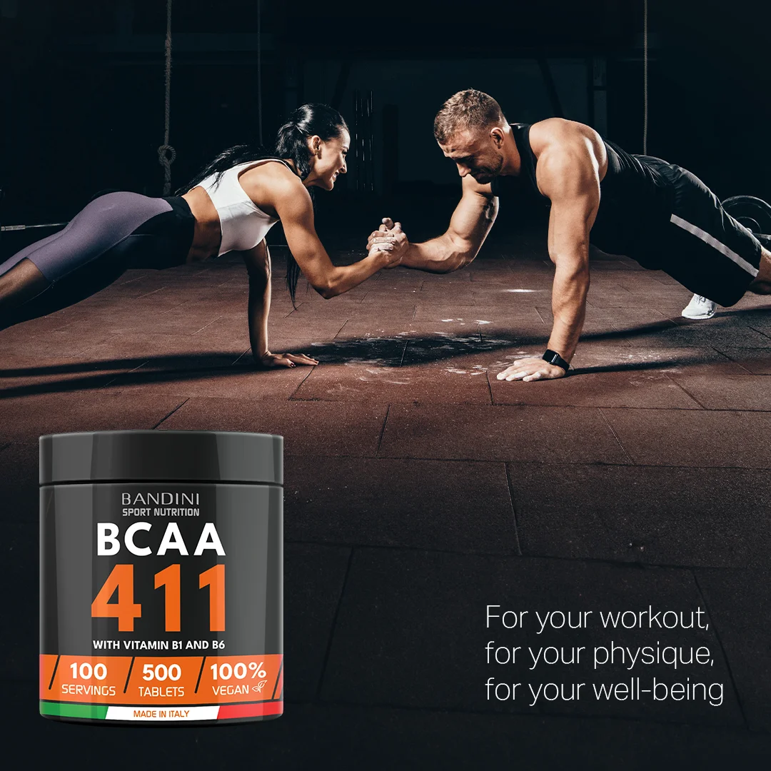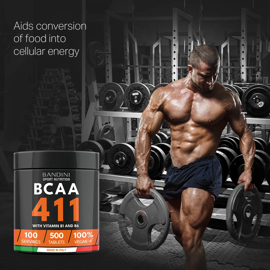 Dietary supplement based on branched-chain amino acids with a balanced 4 1 1 ratio and enriched with vitamins B1 and B6. Package of 500 tablets, providing a total of 100 doses. BCAA 4 1 1 supplements from Bandini Pharma are tested to preserve and build lean muscle mass, providing the right dose of Leucine, Valine, and Isoleucine to complement diet and sports nutrition.